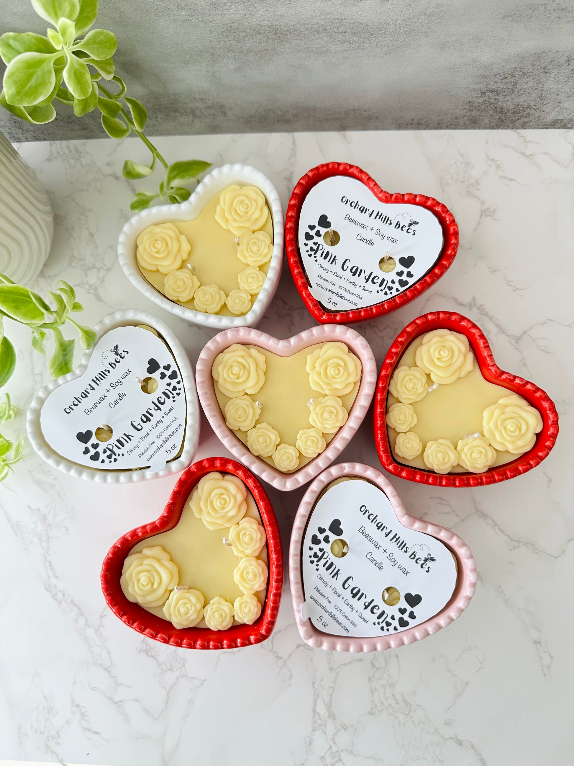 Hand-poured into heart-shaped ramekins, these candles are made from a pure soy wax and backyard-harvested beeswax blend—free from additives for a clean, natural burn. Each candle is beautifully adorned with flower-shaped wax accents, making it as lovely to look at as it is to enjoy.